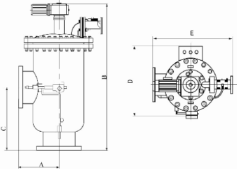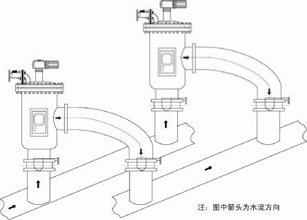 (2)按照自清洗过滤器本体上的箭头提示方向连接管道,使水流方向与本体上的箭头方身一致。自清洗过滤器有两种安装形式(见下图),采取任何一种安装形式时,应注意使自动排污阀的出口方向为水平或向下,以保证排污更彻底。