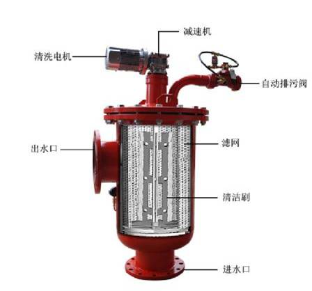当水从进水口进入过滤器滤筒内部,杂质被拦截在过滤筒内壁,过滤后的干净水从出水口流出,当滤筒内壁的杂质越积越多时,自清洗过滤器进出口的压差达到预设值、达到清洗时间或手动预制时,过滤器将开始自清洗过程,整个自清洗过程包含两个步骤:打开位于自清洗过滤器上的自动排污阀;电机带动自清洗过滤器滤网内的清洗刷,被滤网所拦截下来的杂质从排污阀排出,清洗时系统不断流,自清洗过滤器的整个运行过程由随机配备的一个智能控制箱来控制。控制方式可选压差、时间、手动及 PLC 控制。