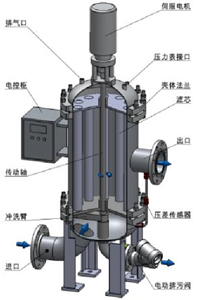 待处理的水由入水口进入机体,水中的杂质沉积在不锈钢过滤网上,由此产生压差。通过压差开关监测进出水口压差变化,当压差达到设定值时,电控器给水力控制阀、驱动电机信号,引发下列动作:电动机带动刷子旋转,对滤芯进行清洗,同时控制阀打开进行排污,整个清洗过程只需持续数十秒钟,当清洗结束时,关闭控制阀,电机停止转动,系统恢复至其初始状态,开始进入下一个过滤工序。